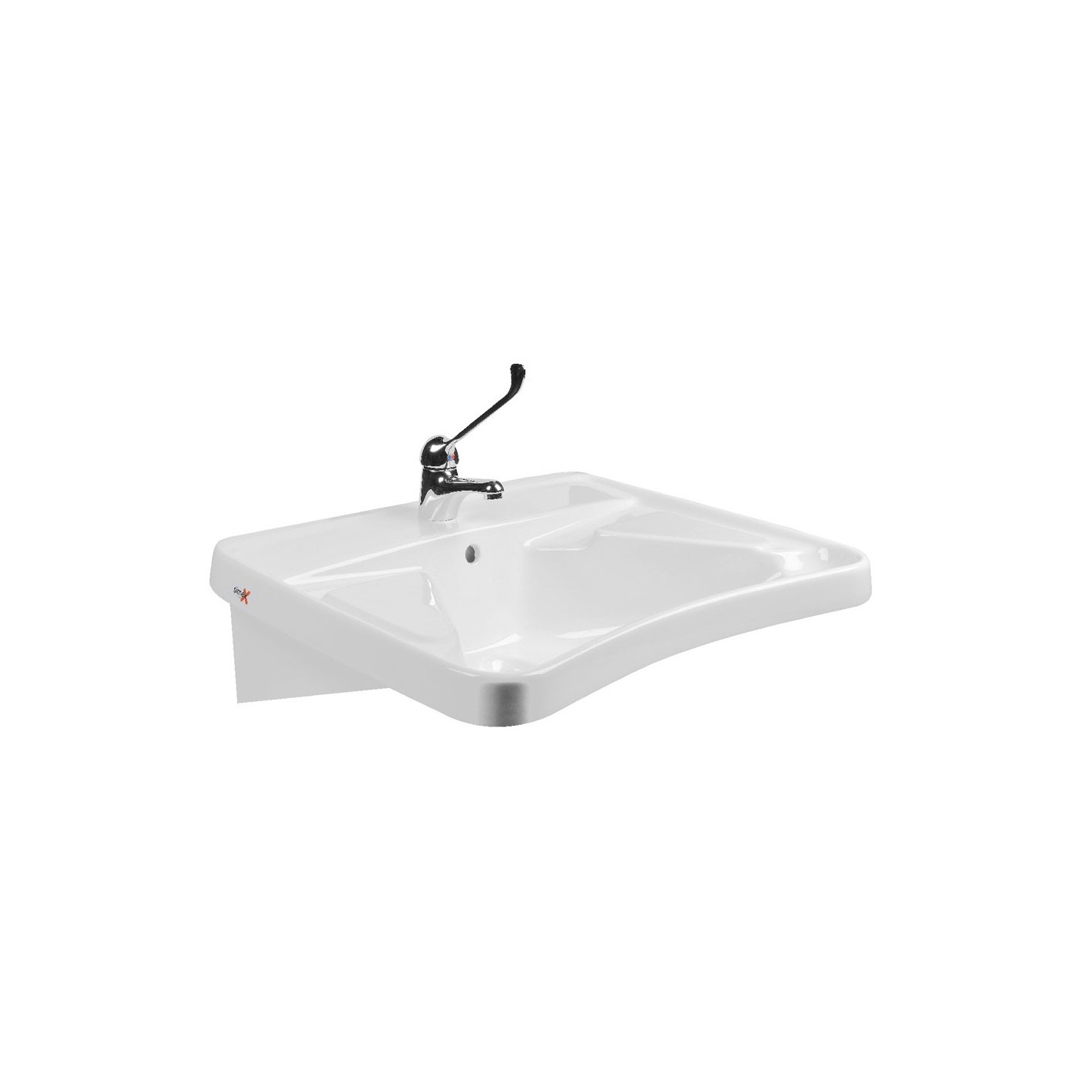 Lavabo de cerámica blanca con instalación en ménsula fija, diseñado para baños adaptados y uso en colectividades. Su diseño ergonómico facilita el acceso a personas con movilidad reducida, garantizando durabilidad y facilidad de mantenimiento.