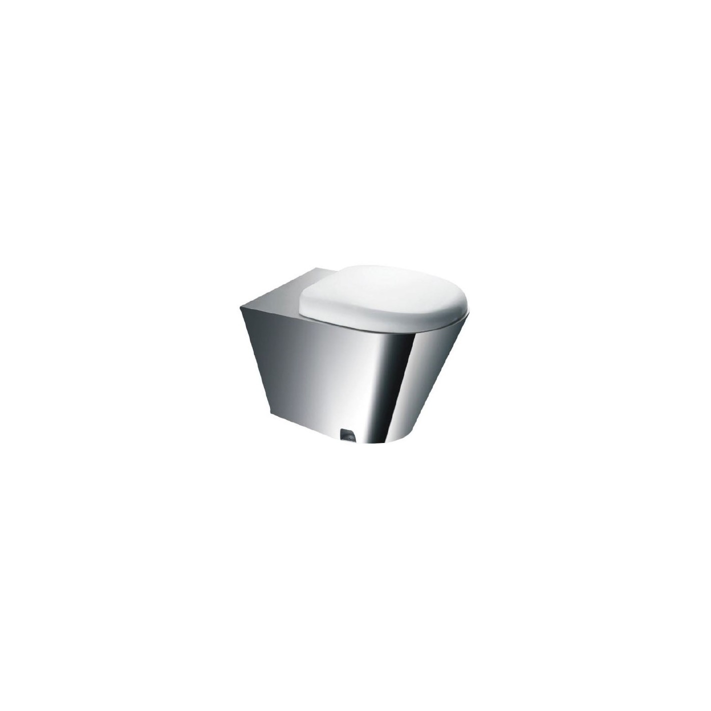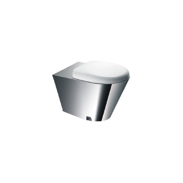 Inodoro suspendido en acero inoxidable AISI 304, acabado satinado o brillante, diseñado para instalación mural. Incluye tapa en ABS blanco y es compatible exclusivamente con fluxómetro o cisterna encastrada.