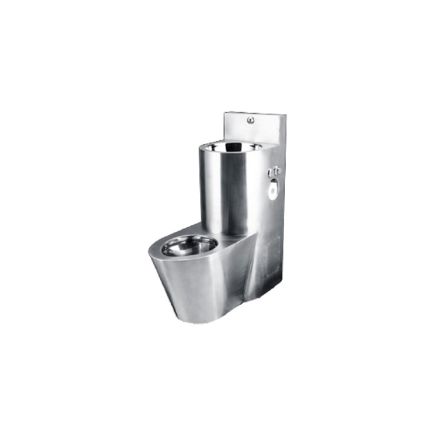 Conjunto compacto de lavabo e inodoro en acero inoxidable AISI 304, con fluxómetro y grifo temporizado. Diseño antivandálico ideal para prisiones y entornos de alto tráfico.