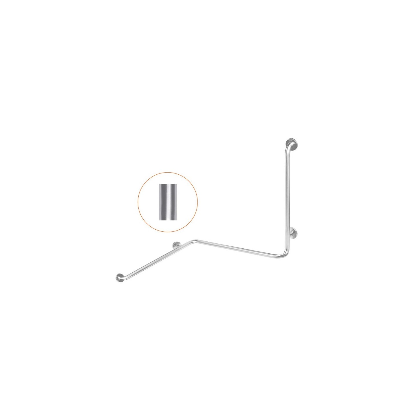Barra en ángulo 3 brazos de acero inoxidable AISI 304, posición izquierda. Resistente, funcional y diseñada para mejorar la accesibilidad en baños adaptados y espacios colectivos.