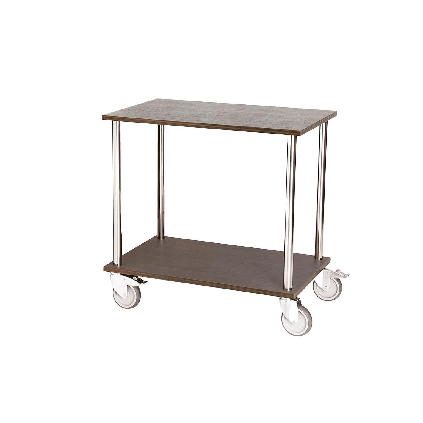 Disponible en dos acabados —roble claro y roble oscuro— se adapta tanto a ambientes modernos como tradicionales, combinando calidez visual con un estilo sobrio y profesional. Su diseño equilibrado proporciona una excelente capacidad de carga y maniobrabilidad, facilitando el traslado de vajilla, bandejas, bebidas y utensilios de trabajo.