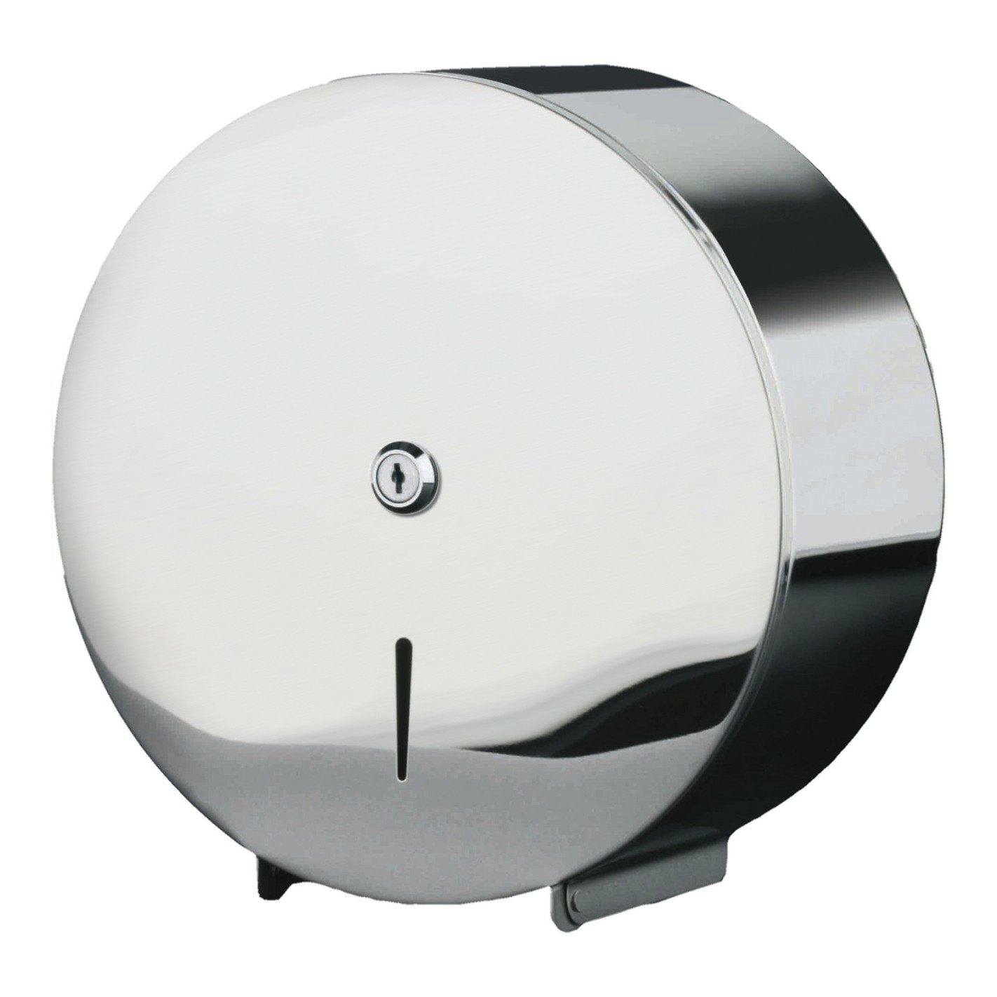 Portarrollos industrial de pared fabricado en acero inoxidable AISI 201, con cerradura de seguridad y alta resistencia al uso intensivo. Ideal para baños públicos, hoteles, centros comerciales, hospitales y colectividades. Disponible en inox brillo e inox satinado, con fijación incluida y resistencia certificada a la corrosión.