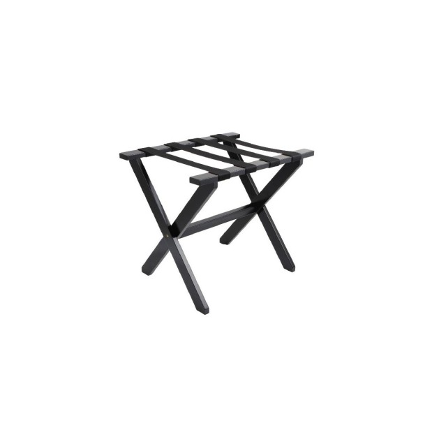 Su diseño plegable permite optimizar el espacio, facilitando su almacenaje cuando no está en uso, mientras que sus cinco cintas negras tejidas en nylon y poliéster proporcionan un apoyo estable y seguro para maletas de diferentes tamaños y pesos.