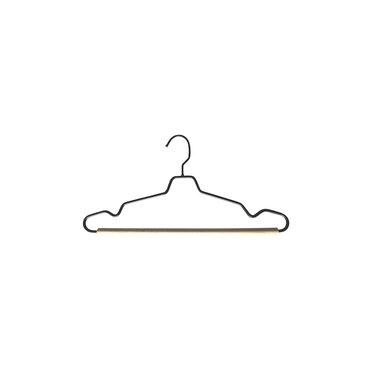 Percha de diseño compacto con estructura metálica y barra de madera, ideal para prendas pequeñas. Disponible en blanco y negro. Se suministra en caja de 75 unidades.