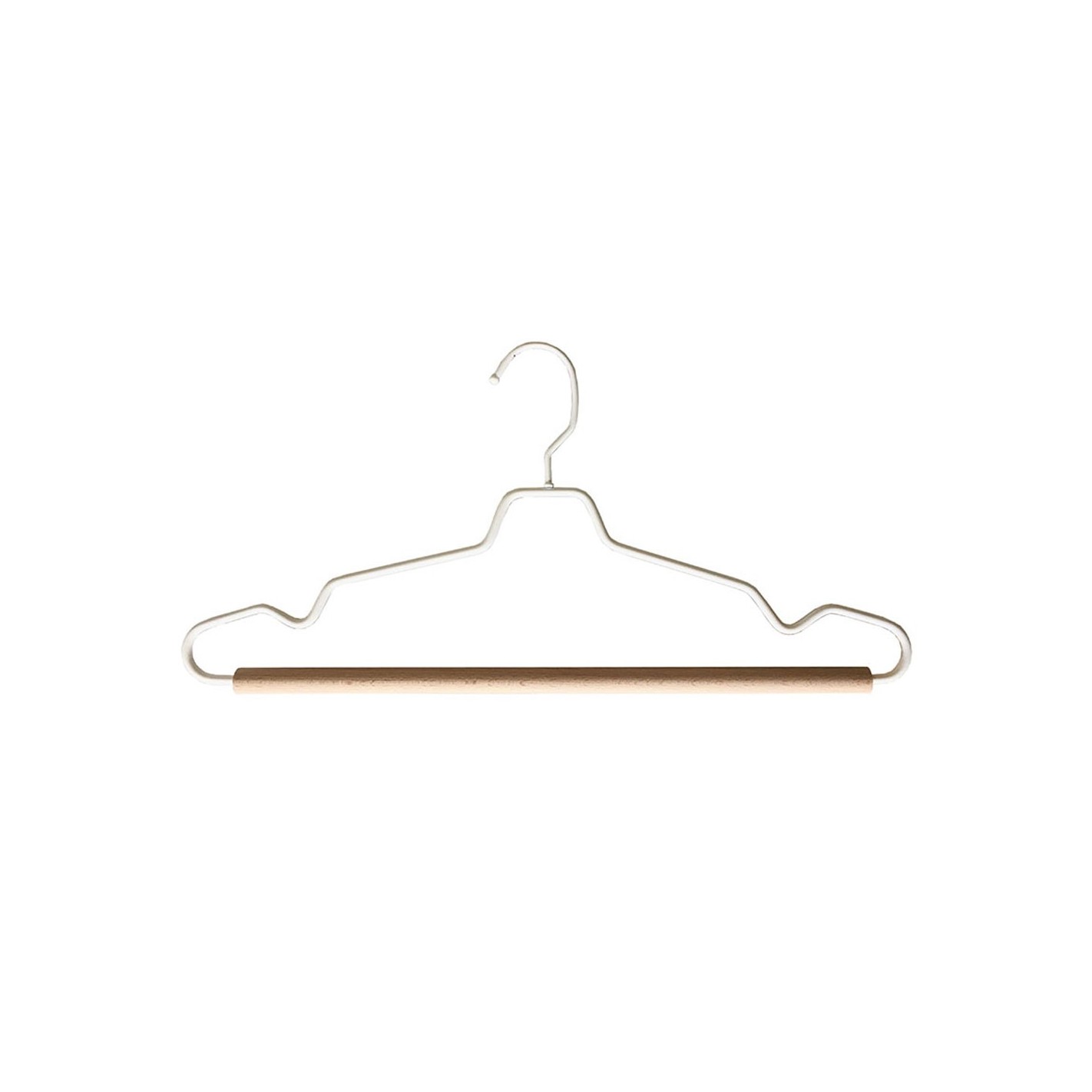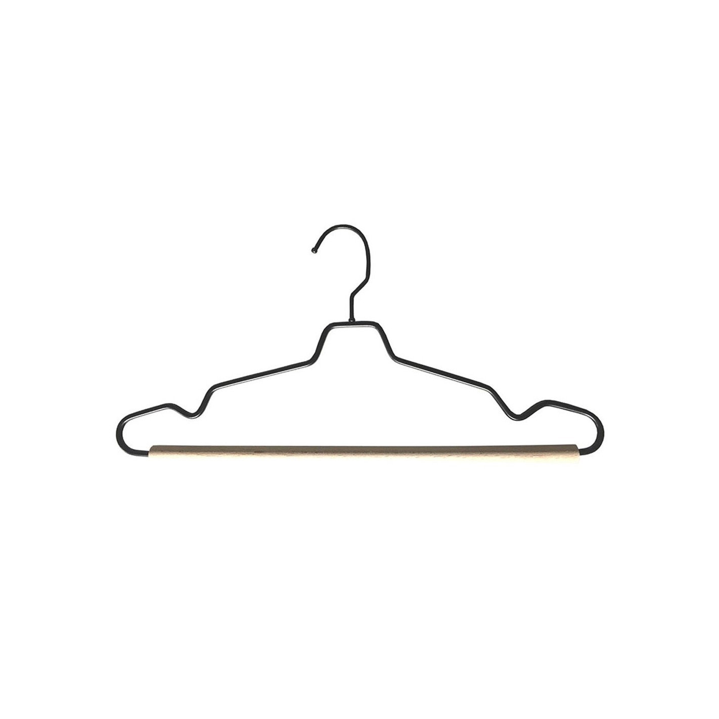 Percha metálica de 40 cm con barra de madera integrada, ideal para colgar prendas con estilo y resistencia. Disponible en blanco y negro. Se suministra en caja de 75 unidades.