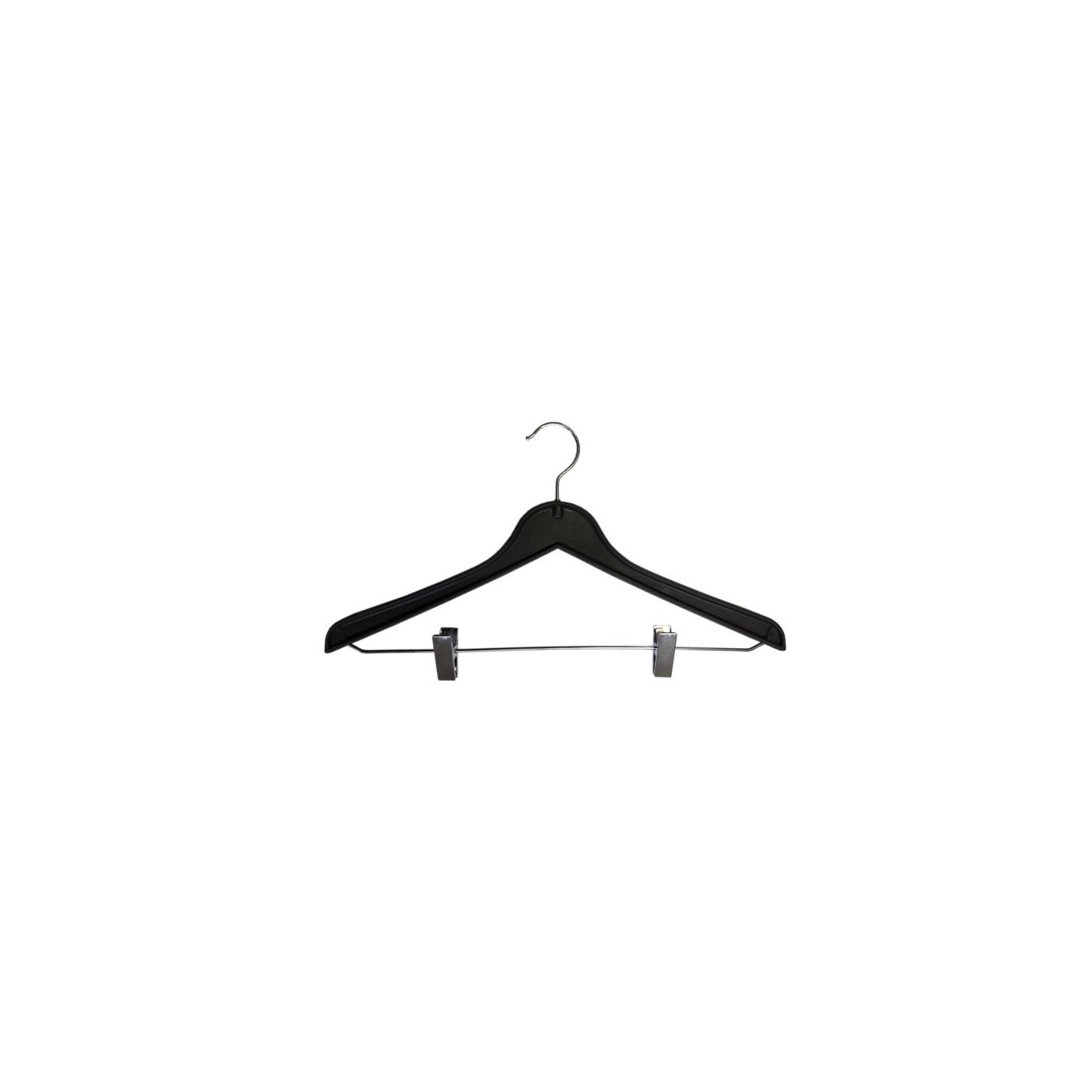 Percha maciza de plástico de 38 cm con muescas antideslizantes y barra inferior. Disponible en negro y blanco, es una solución práctica y resistente para prendas superiores e inferiores. Se suministra en caja de 75 unidades.