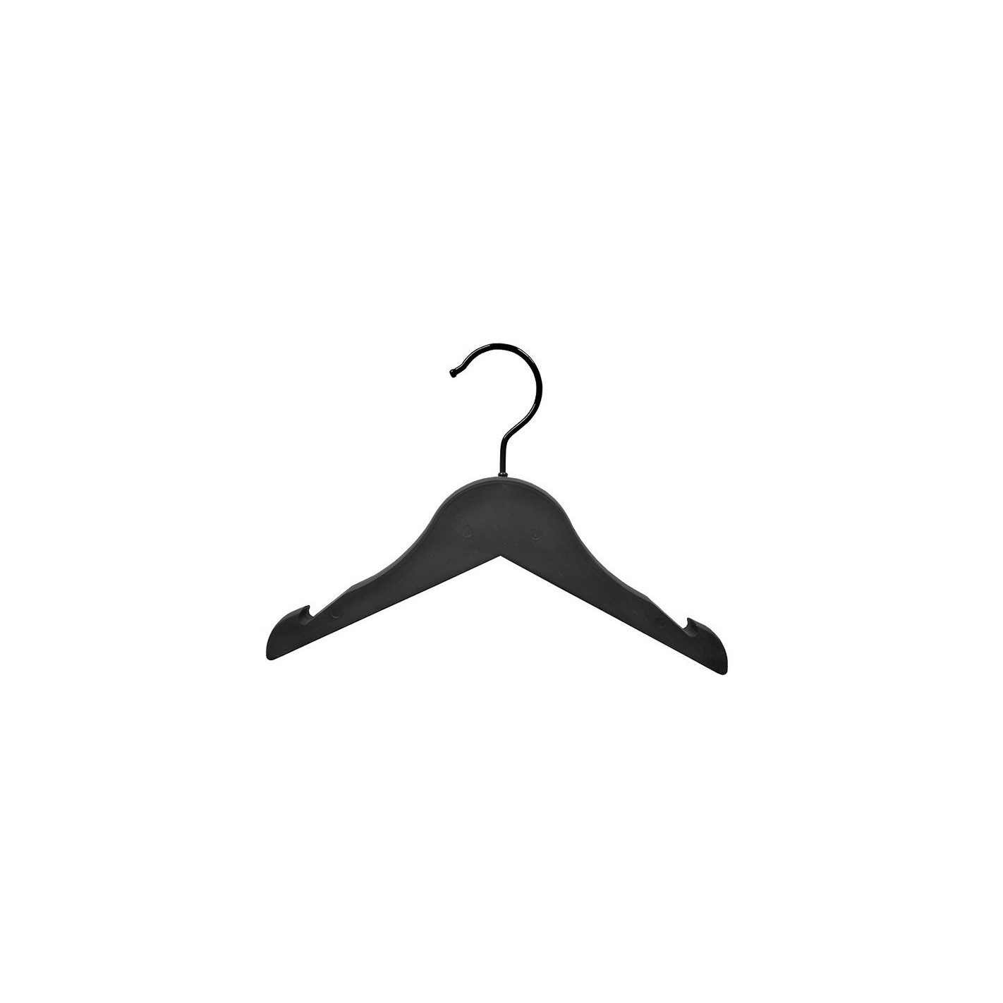 Percha compacta de plástico macizo de 27 cm con muescas en los hombros. Ideal para ropa infantil o prendas ligeras en espacios reducidos. Disponible en negro y blanco. Se suministra en caja de 75 unidades.
