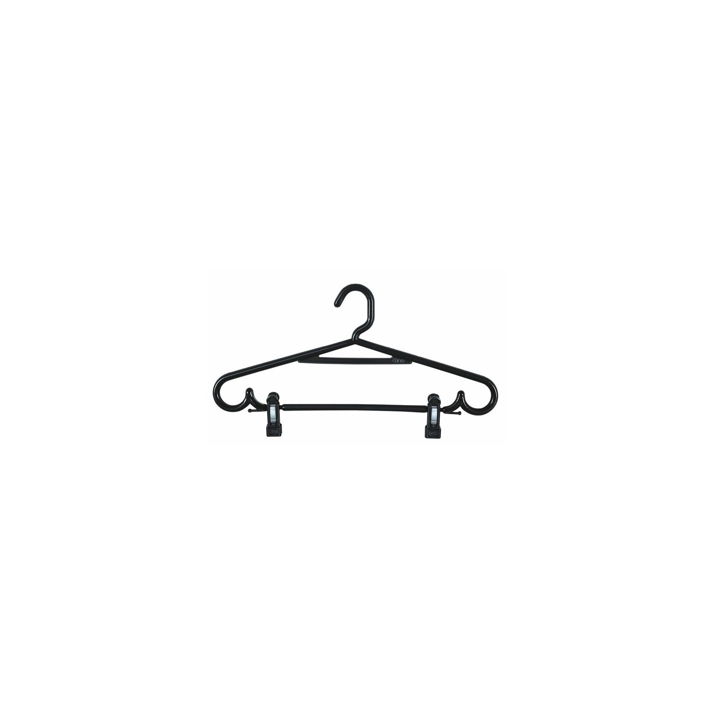 Percha de plástico resistente con pinzas ajustables para una sujeción firme y segura de prendas. Disponible en acabados blanco y negro. Se suministra en caja de 40 unidades.
