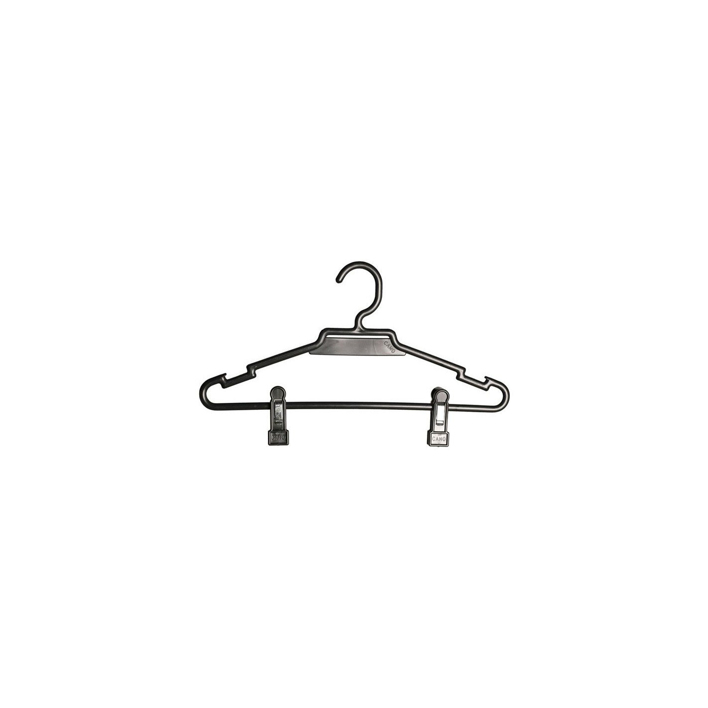 Percha de plástico de 40 cm con muescas y pinzas, perfecta para colgar prendas superiores e inferiores. Disponible en blanco y negro. Se suministra en caja de 50 unidades.
