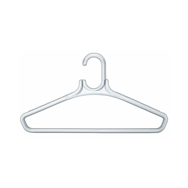 Percha de plástico resistente de 45 cm, ideal para camisas, chaquetas o uniformes. Disponible en acabados blanco y negro. Se suministra en caja de 32 unidades.