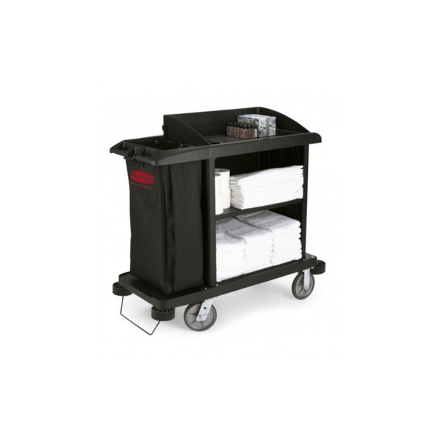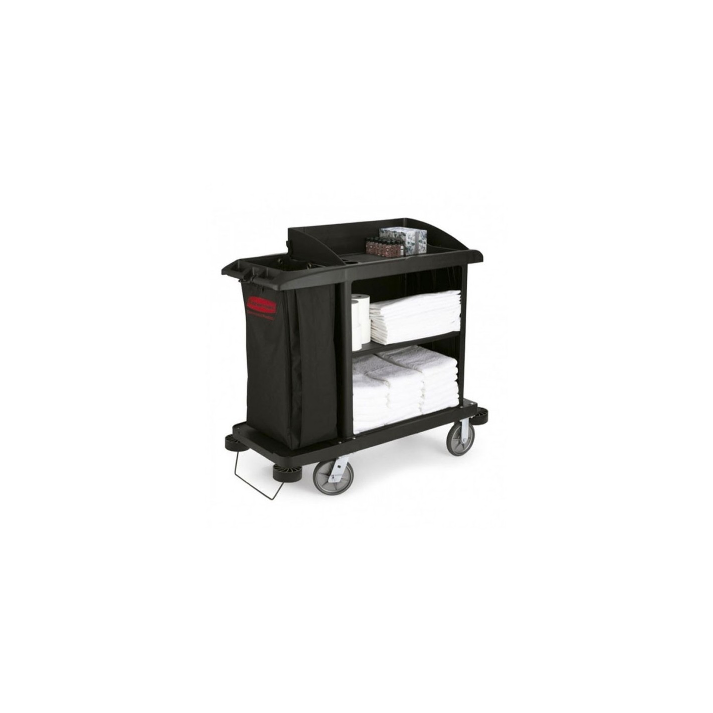 Carro camarera mediano con estantes para portar lencería y bolsa lateral para residuos.