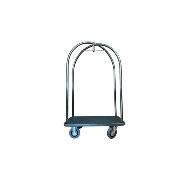 Dispone de barra perchera superior para colgar prendas y uniformes, y una plataforma metálica recubierta con moqueta gris que protege el equipaje de roces y daños. Sus dos ruedas fijas y dos ruedas giratorias de gran diámetro (200 mm Ø) garantizan un desplazamiento suave, seguro y silencioso incluso con cargas pesadas.