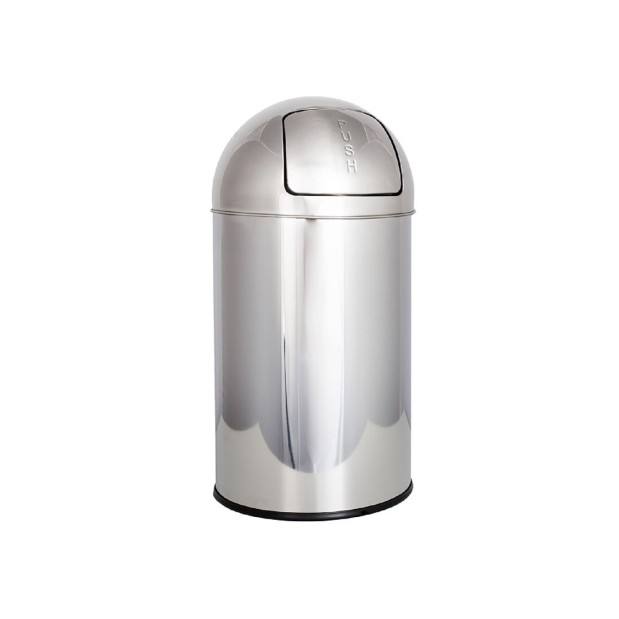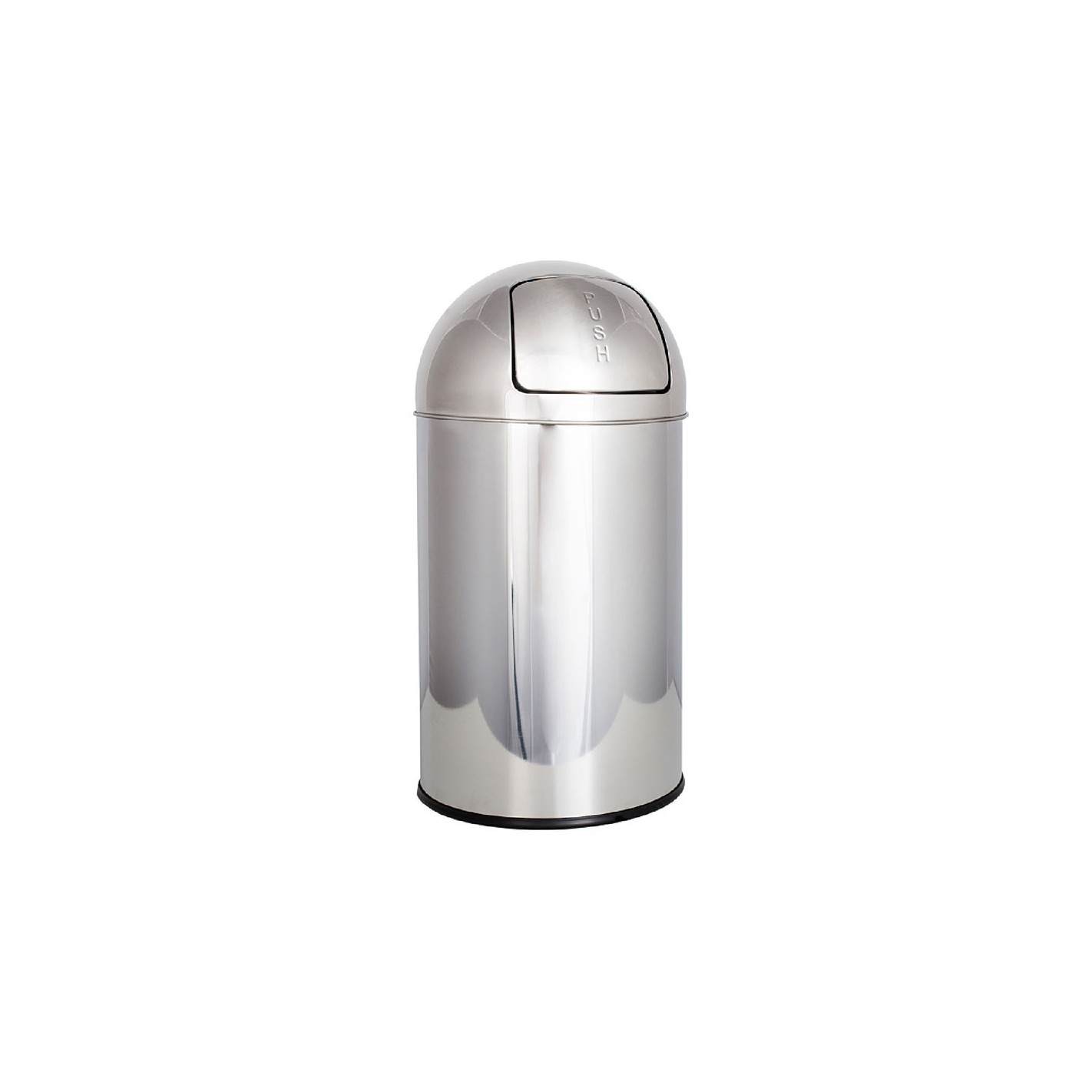 Papelera Push de 18 L en acero inoxidable brillante, con tapa basculante de presión. Compacta, resistente y fácil de limpiar, ideal para oficinas, hospitales, hoteles y espacios públicos.