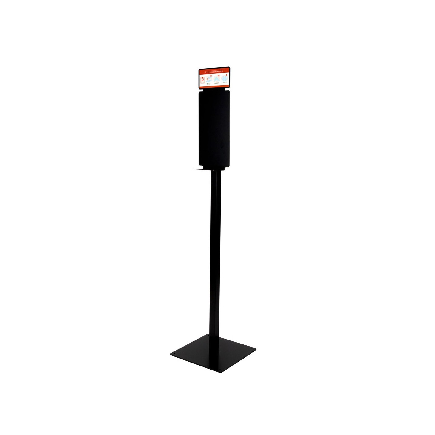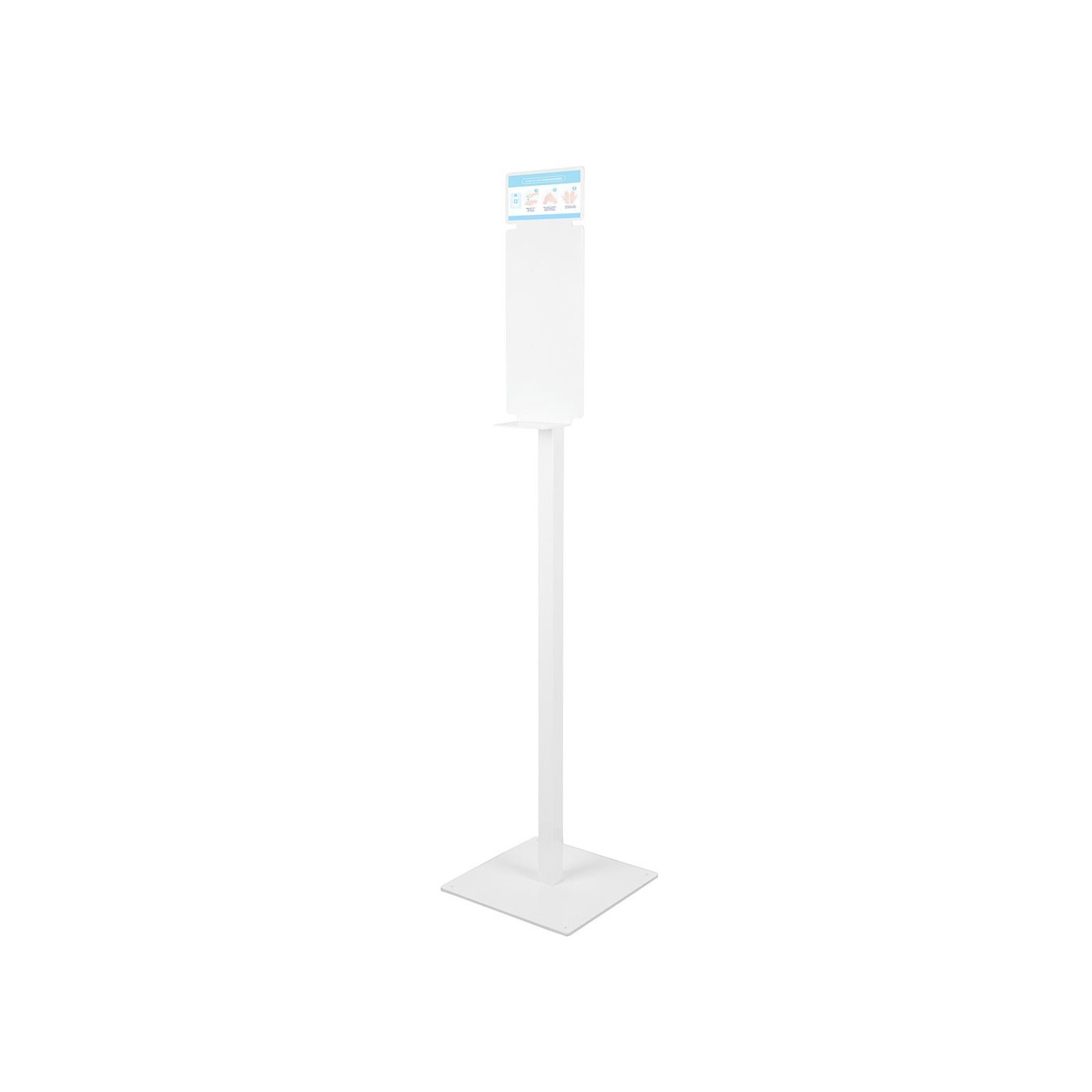Soporte metálico para dispensador de gel o jabón higienizante, fabricado en acero de alta resistencia. Incorpora una placa superior para colocar señales informativas o advertencias. Disponible en acabado blanco o negro.