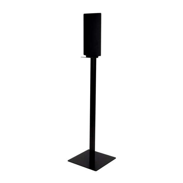 Soporte de suelo para dispensadores de gel o jabón, fabricado íntegramente en acero de alta resistencia. Incorpora una placa superior para cartelería informativa o advertencias. Acabado en color blanco o negro.