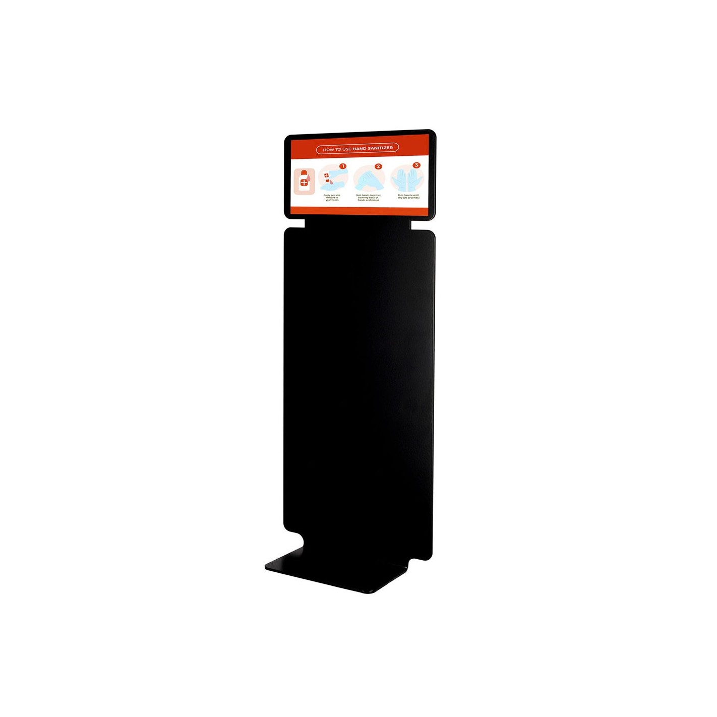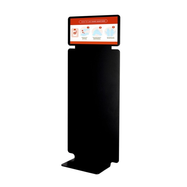 Soporte compacto de acero para dispensador de gel, diseñado con placa superior para señalización informativa o advertencias. Disponible en blanco o negro, ideal para entornos donde el espacio es reducido y la higiene es prioritaria.