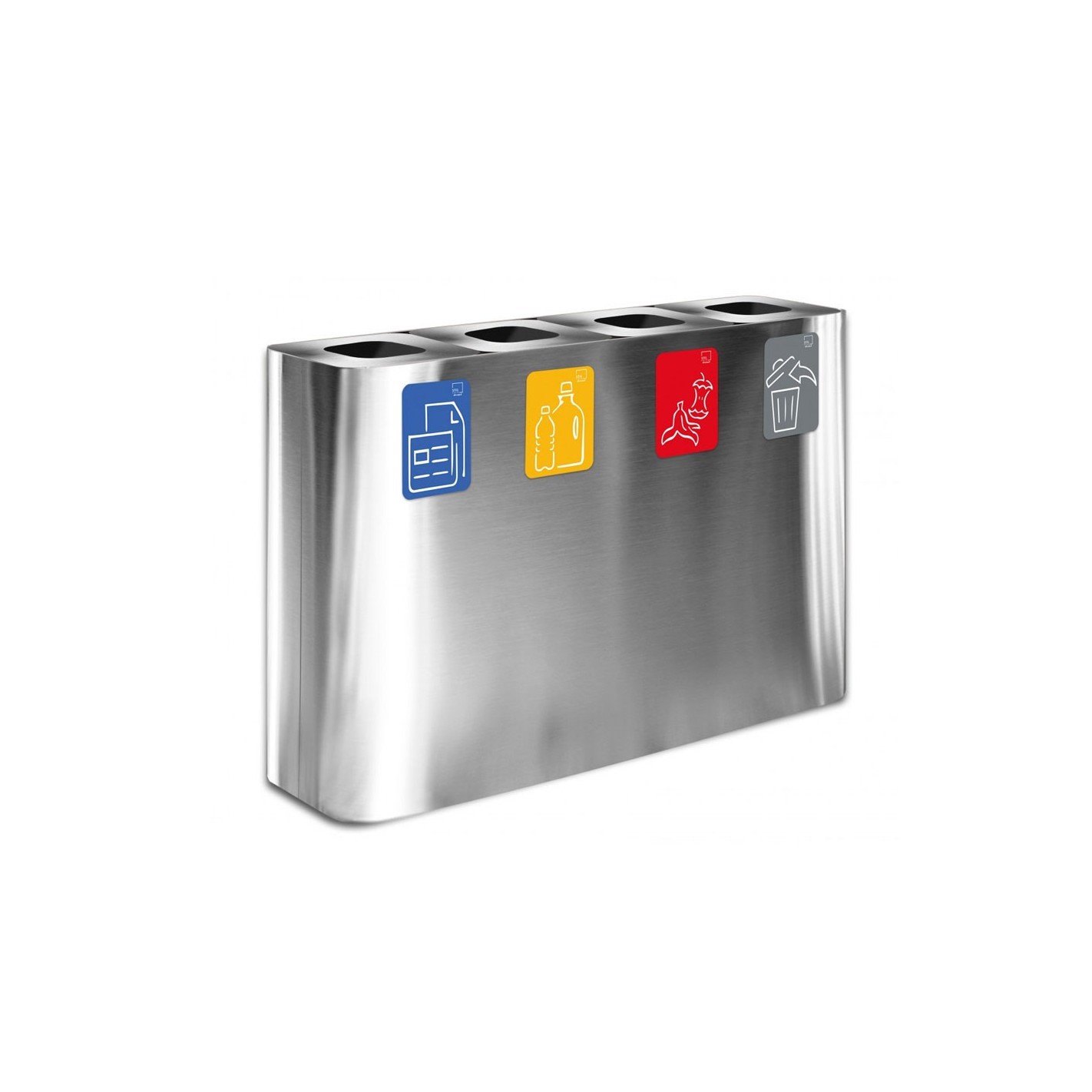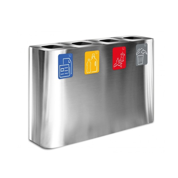 Contenedor de reciclaje PURE de 240 L con 4 módulos de 60 L, fabricado en acero pintado o inoxidable satinado. Incluye tapas diferenciadas, kit de pictogramas y sistema de vaciado fácil, ideal para entornos profesionales, comerciales y colectivos que buscan eficiencia y diseño en la gestión de residuos.
