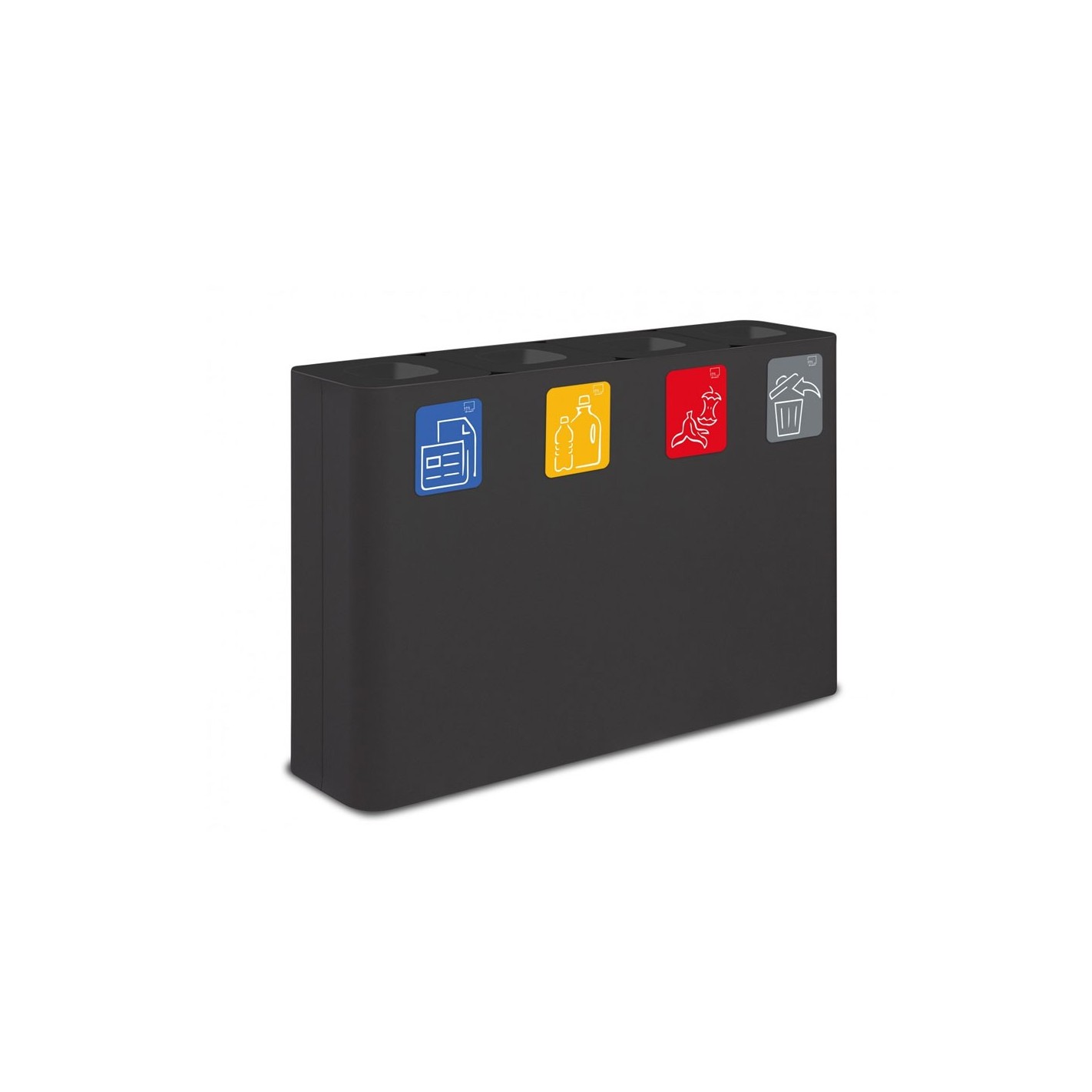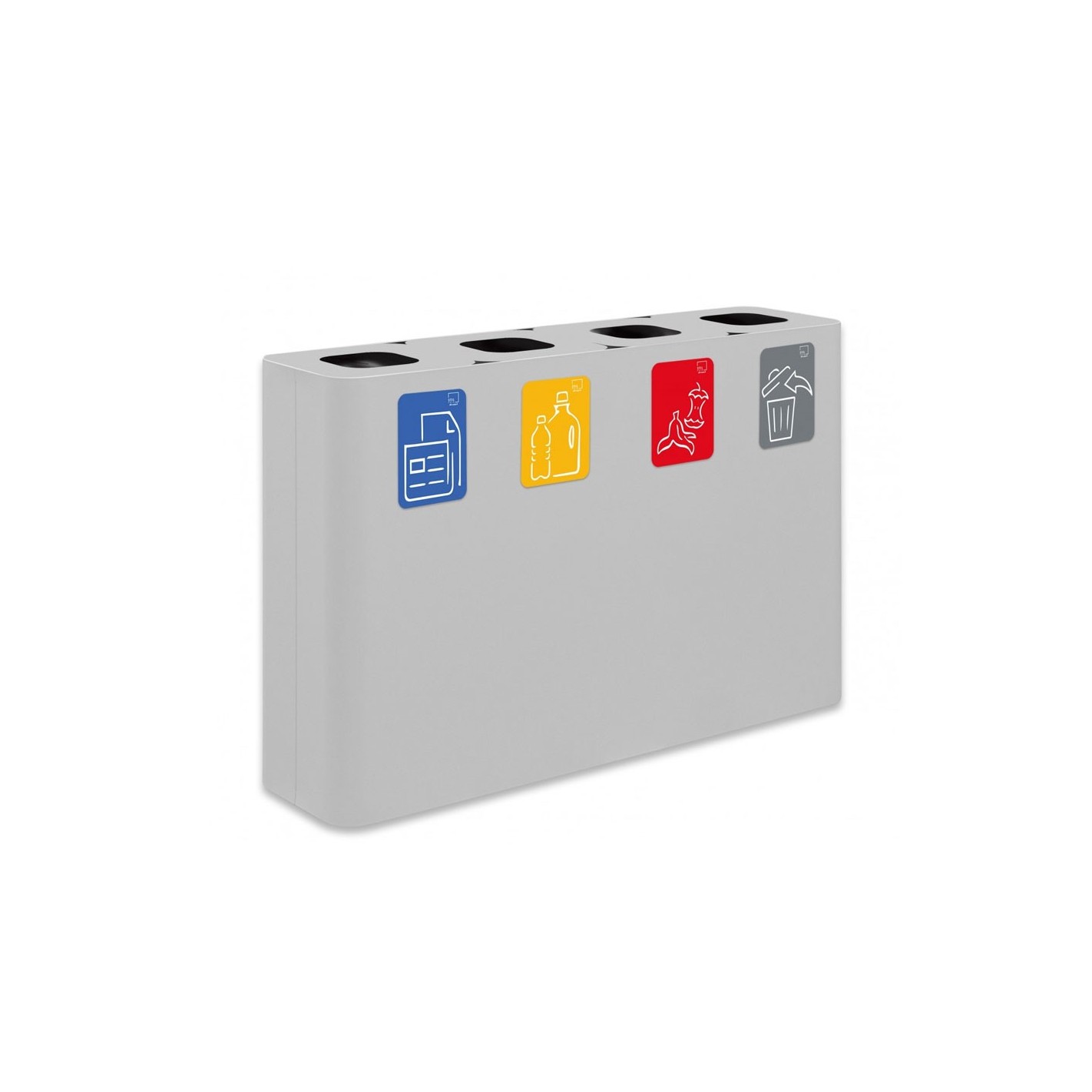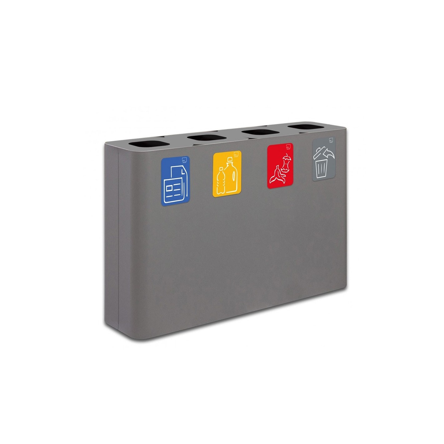 Su diseño PURE, de líneas rectas y minimalistas, aporta una estética moderna y profesional, ideal para entornos donde la funcionalidad no debe comprometer la imagen del espacio. Además, incluye kit de pictogramas e iconografía normalizada por colores, lo que garantiza una clara identificación y cumplimiento con las normativas de reciclaje vigentes.