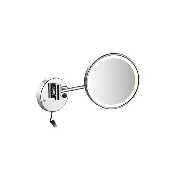 Espejo de aumento x3 con luz LED integrada y brazo oscilante, diseñado para instalación en pared. Fabricado en acero inoxidable y latón, ofrece iluminación regulable en tres temperaturas de color y un acabado elegante disponible en negro mate, oro, cromo brillo o cobre. Ideal para baños modernos, hoteles y espacios profesionales.